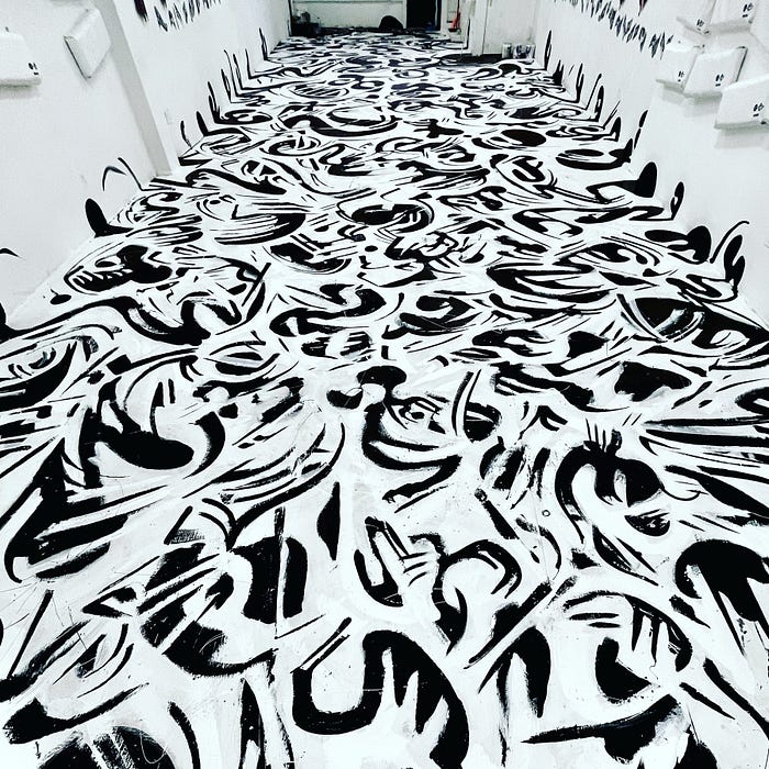 However, what distinguishes Love’s work from purely abstract or gestural painting is his command of technical skill and form. His background in calligraphy and his deliberate approach to mark-making provide an aesthetic discipline that anchors his compositions within the realm of fine art. His fluid gestures are not merely spontaneous; they are executed with precision, allowing the artwork to retain a sense of intentionality even as it remains open to multiple readings.